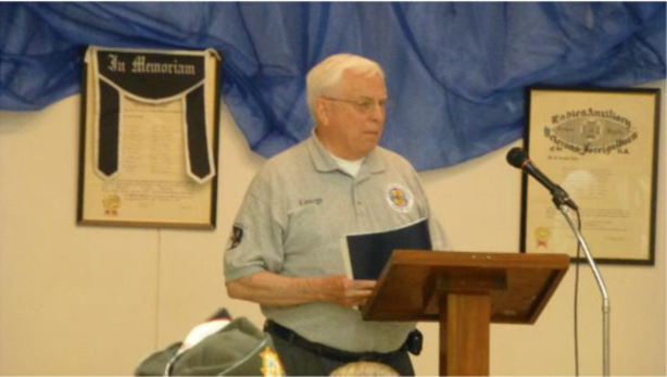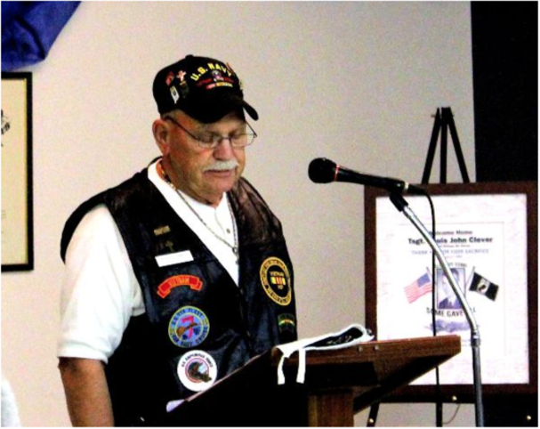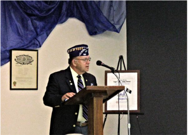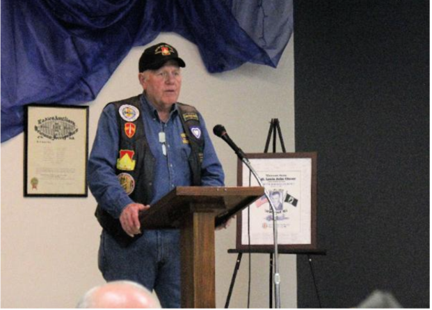 Sydney Staton, Commander of Chapter 125, Military Order of the Purple Heart and member of Chapter 1028, makes a presentation to Paul Clever.