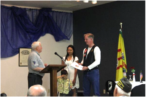 Chapter member George Collier who also served inPleiku, Vietnam presents the Clever family with a booklet of information and photographs of the Air Force operation at Pleiku Air Base and the Central Highland city of Pleiku.