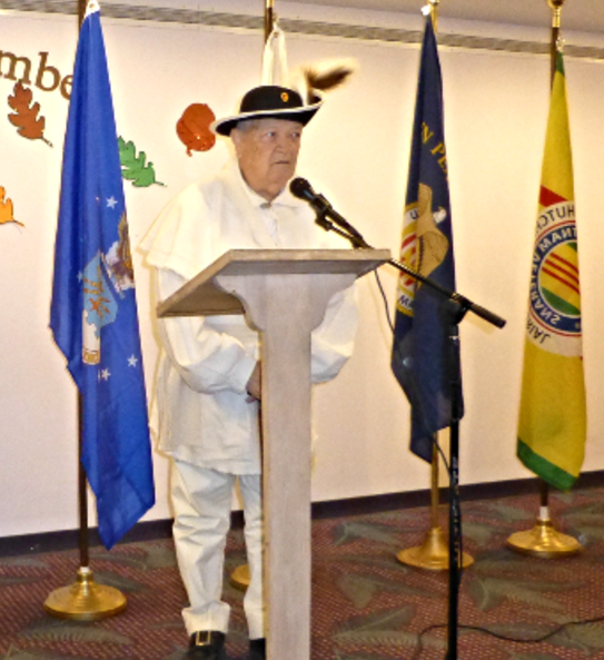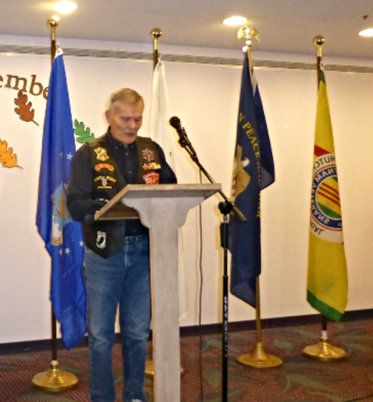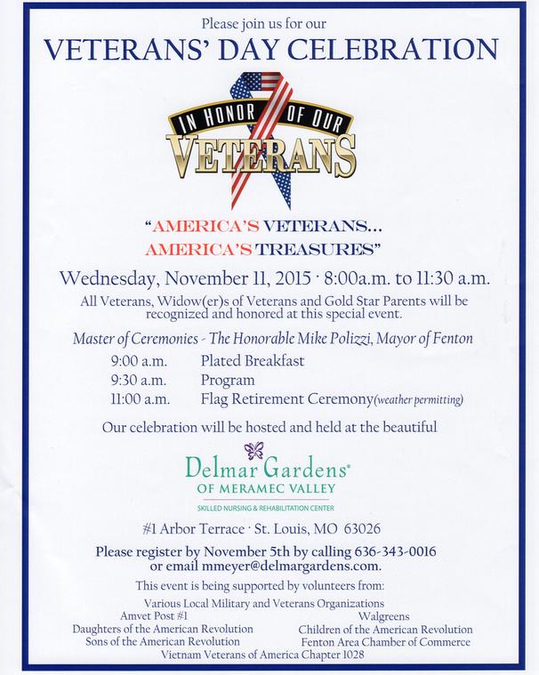 On November 11th, members of Chapter 1028 attended a Veterans Day ceremony at the Delmar Gardens of Meramec Nursing Home. The Chapter's Honor Guard presented the colors and conducted a flag retirement ceremony. The event featured speakers from our Chapter. Treasurer Tom Brophy gave the Missing Man Table presentation. Member Bill Groth representing the Sons of the American Revolution also spoke.