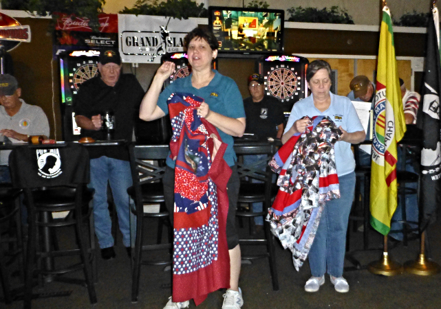 Donna Robinson of Quilts of Valor attended the monthly meeting to receive a donation from the Chapter and also displayed one the quilts they are working on.