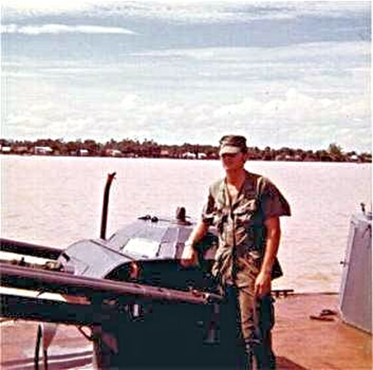 Jim on the bow gun of an Alpha boat. Long Xuyen in the background.